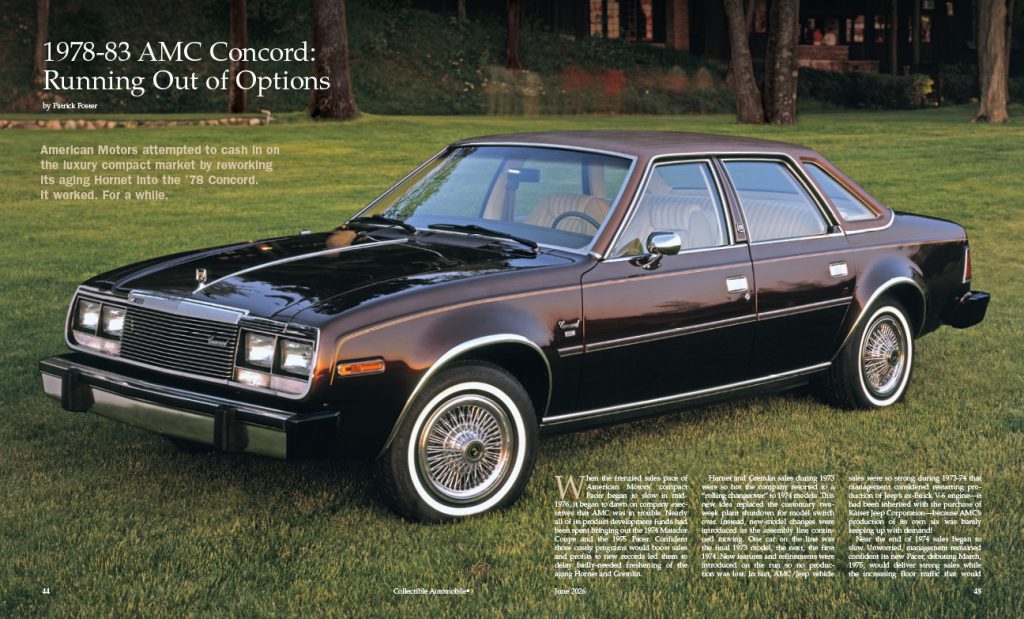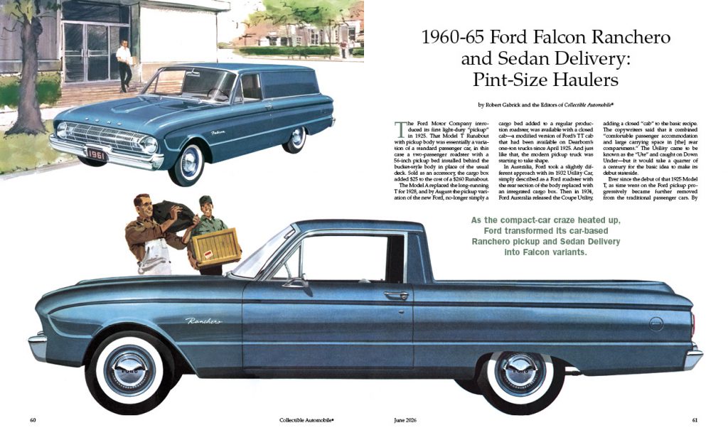 The August 2026 issue includes a look at the 1977-81 Pontiac Firebird, Ford during the AMA “racing” ban, and two more topics from automotive history. Photo features highlight a 1932 Auburn 12-160A Speedster, a 1952 Nash-Healey roadster, and a 1962 Lotus Elite Type 14 coupe. The Collectible Commercial Vehicles are a 1947 Studebaker M5 pickup and a 1946 Studebaker M16.